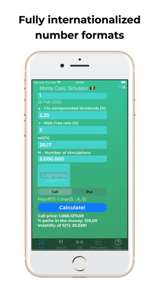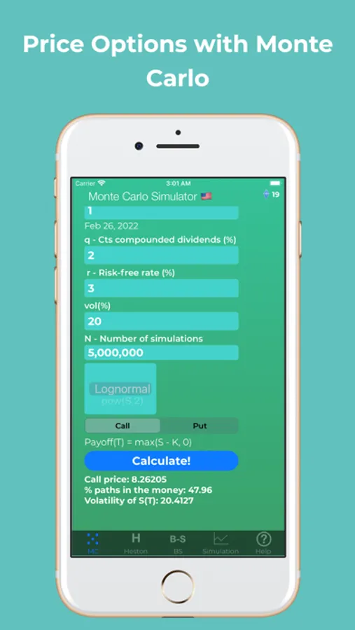 The Options Pricing Monte Carlo app prices power options: max(S^i -K,0) or max(K-S^i,0). It also shows the % of paths with positive payoffs. The normal inverse is calculated with Beasley-Springer-Moro method.