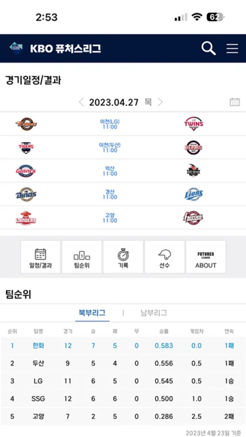 1. KBO 퓨처스리그 일정, 기록, 오늘의 등록/말소 제공