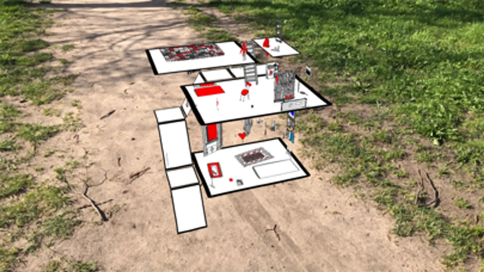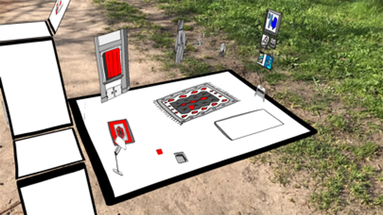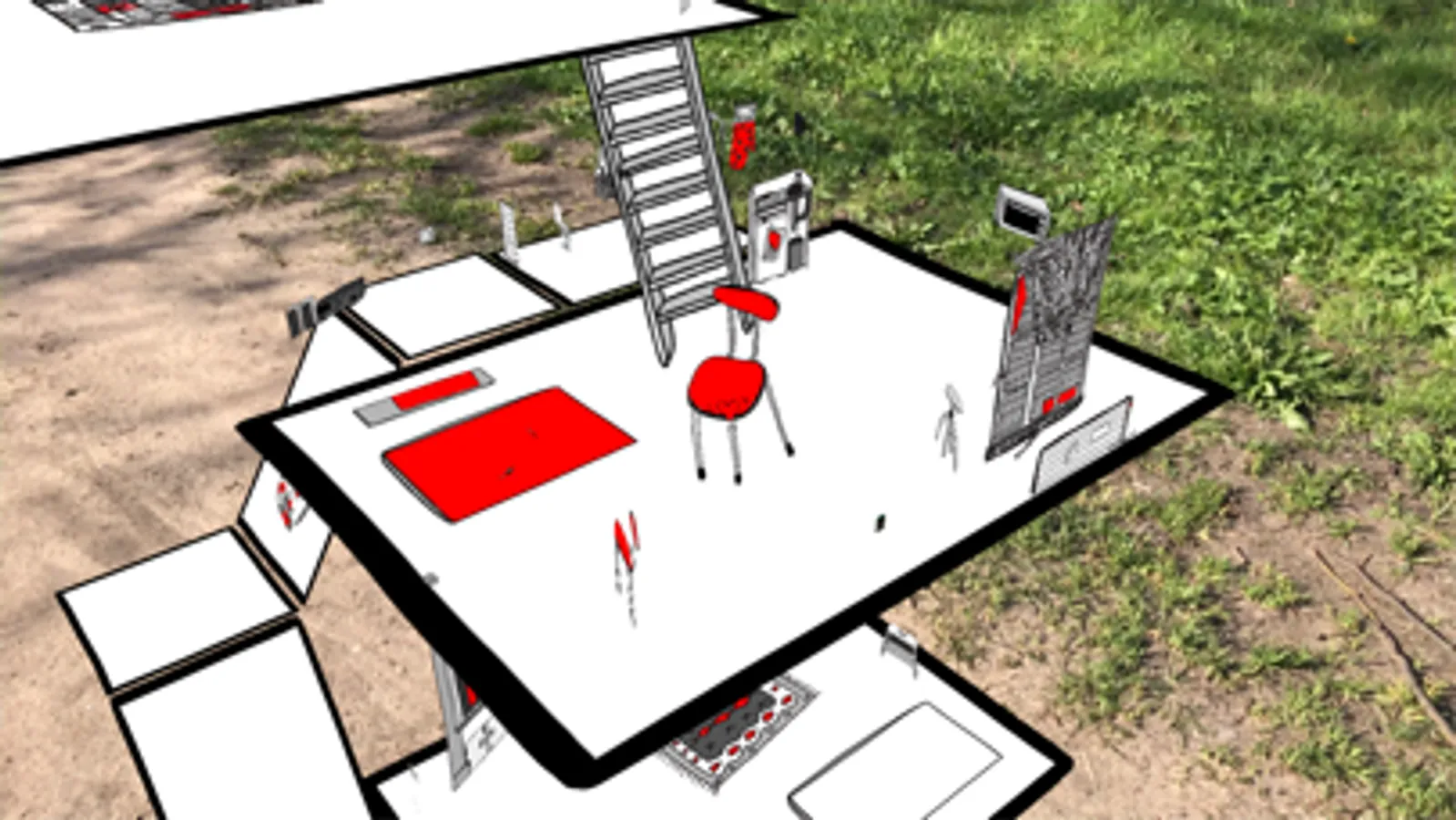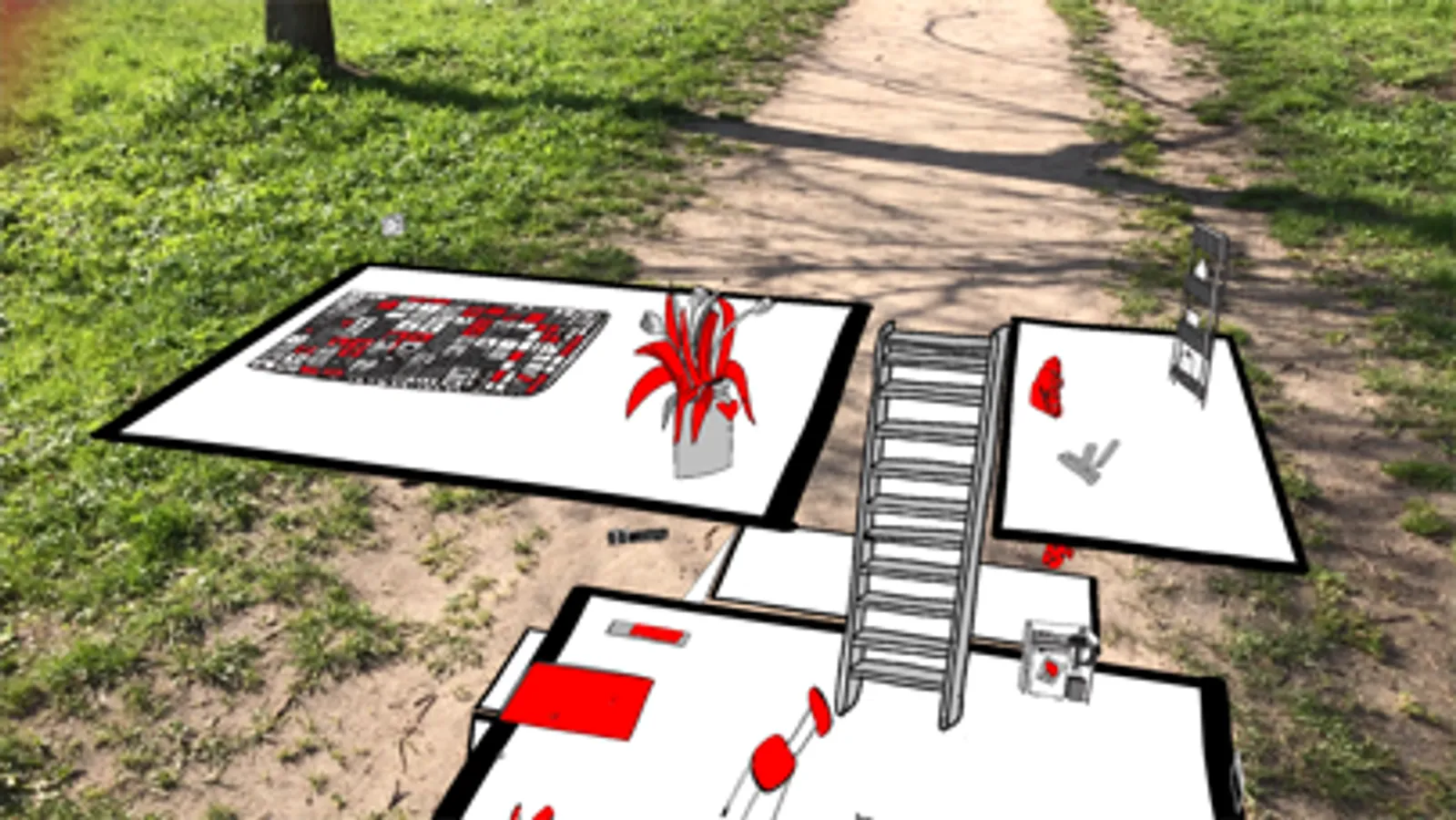 Game designer Adriaan de Jongh and artist Giulia Bierens de Haan were interested in this notion and decided to make this the theme of a 24-hour art jam taking place at Giulia’s house. The result is interactive augmented reality art that gives you the opportunity to navigate in a space and to play with the sizes of things.