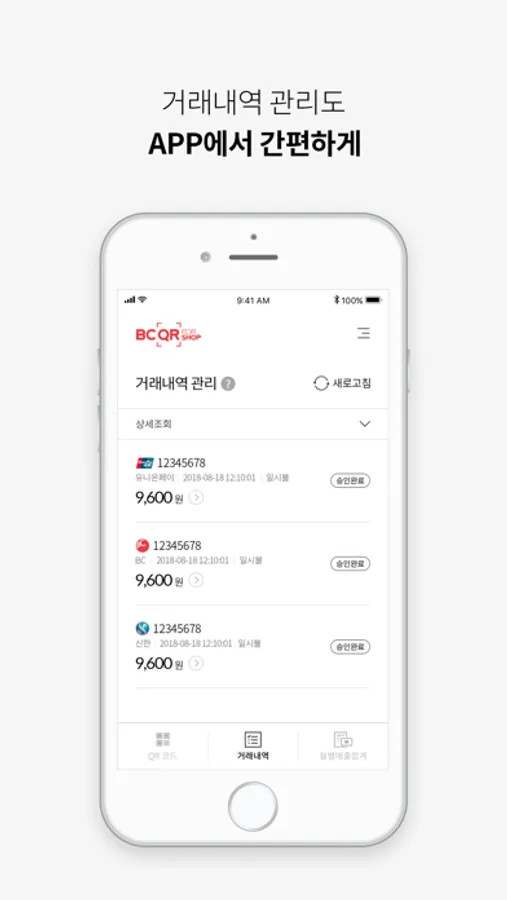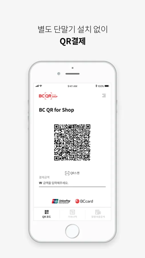 BC 페이북, 유니온페이(중국 고객) APP 및 다른 카드사 APP을 가지고 있는 고객이 BC QR for Shop의 QR코드를 스캔하여 결제할 수 있습니다.