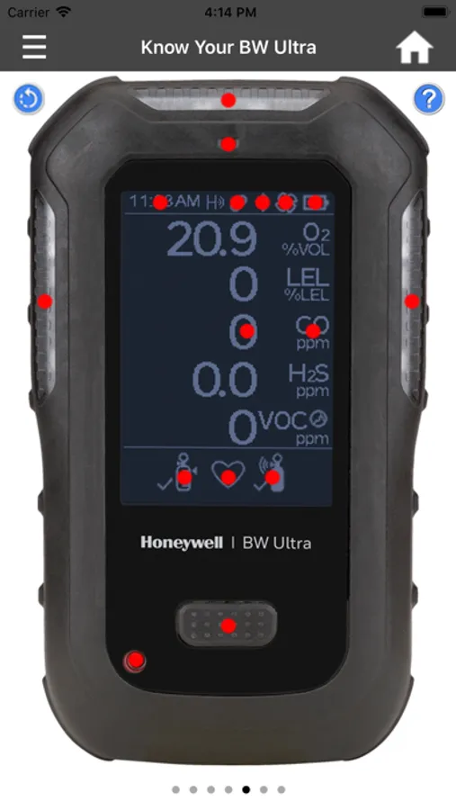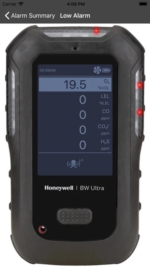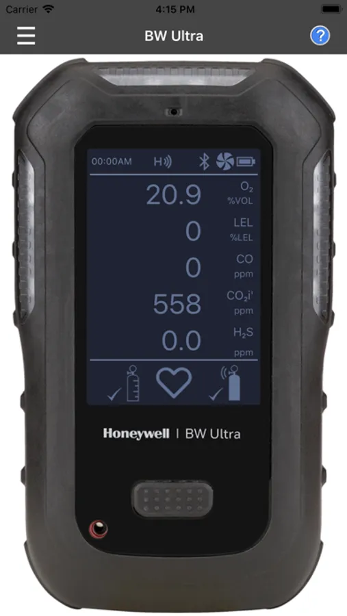 The Honeywell BW Ultra app duplicates the experience of operating a BW Ultra handheld gas monitor. It comes with an interactive tutorial, which simulates navigation through the BW Ultra user interface via the same buttons and display as an actual instrument. By default, the app shows normal readings for configured sensors.
