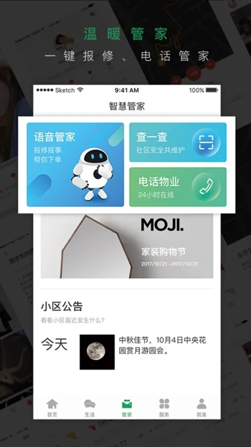 这里有园区生活中的物业服务,包含了基础物业服务、园区生活服务、周边商圈服务和理你社交服务的一站式园区生活服务平台。