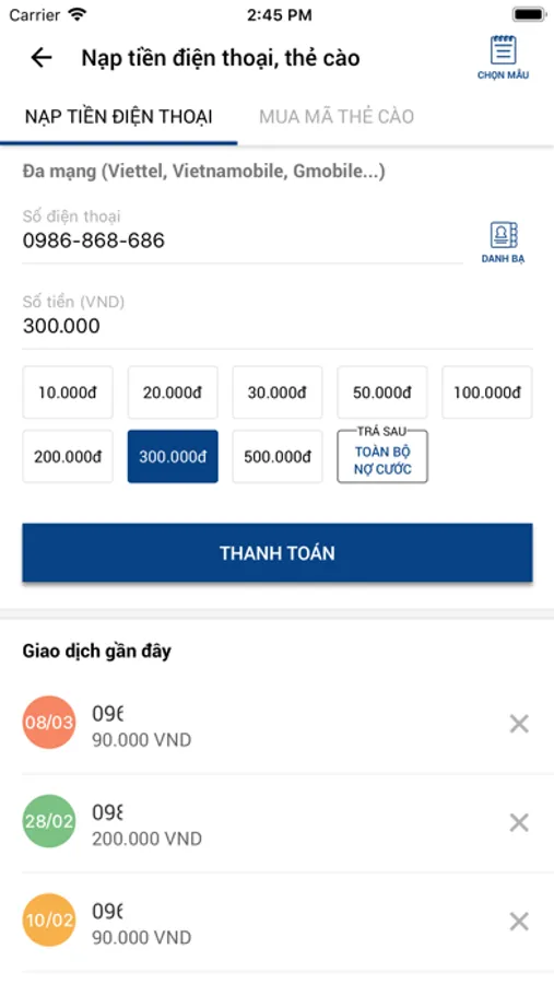 - Mua thẻ cào, Top up: Hưởng chiết khấu 3% đến 5% khi nạp thẻ điện thoại, mua thẻ cào tất cả các nhà mạng.