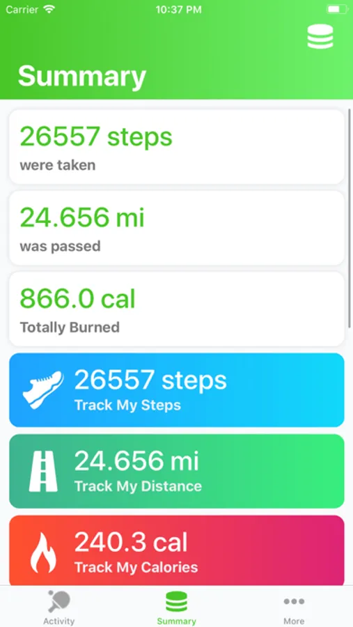 You can view the overall summary from all "Track My" series apps you have installed on your iPhone. Find out total steps, distance and calories recorded during the all your Activities. Also you can view the summary per each app separately.