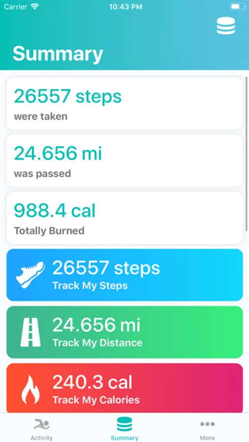 You can view the overall summary from all "Track My" series apps you have installed on your iPhone. Find out total steps, distance and calories recorded during the all your Activities. Also you can view the summary per each app separately.