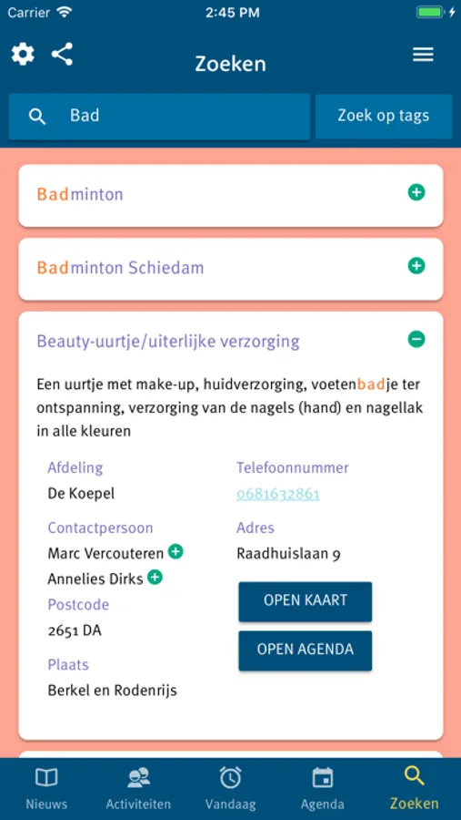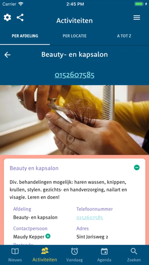 - Adres-, telefoon- en contactpersoon gegevens van de activiteit en van de afdeling waar een activiteit wordt gehouden;