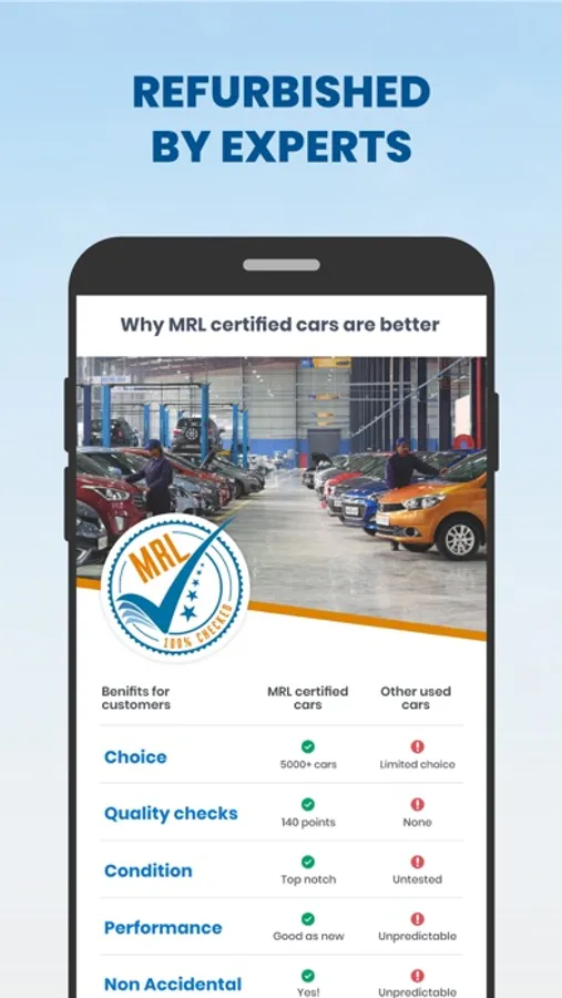 -Cars that are ready for the road: Each car we sell undergoes 140 quality checks and is refurbished at our state-of-the-art Mega Refurbishment Labs (MRL)