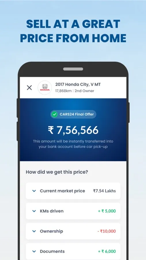 -Seller Protection Policy: Should the car you sold meet with an accident, or the new owner gets speeding tickets, don’t worry—CARS24 provides complete legal support to its customers, free of cost