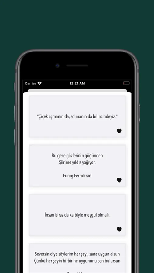 Türk şiiri ve edebiyat severlerin buluşma noktası! Günlük şiir alıntıları ve özlü sözler sunan modern uygulama ile her gün ilham alın.