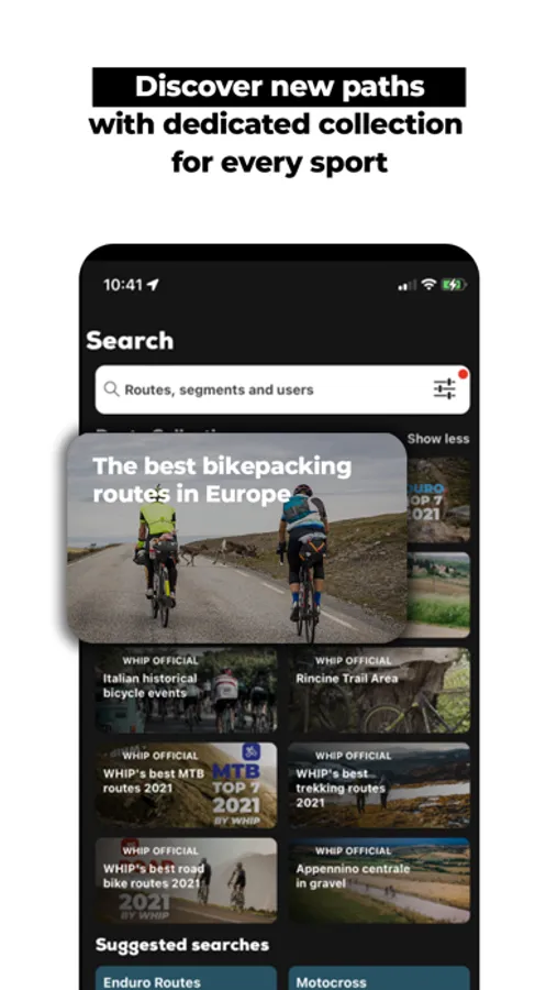 Find the best routes and segments made by other riders and runner in your area through map search. On WHIP LIVE you can find over 300,000 routes with infos about suited sport activity, difficulty, elevation gain, length and distance.