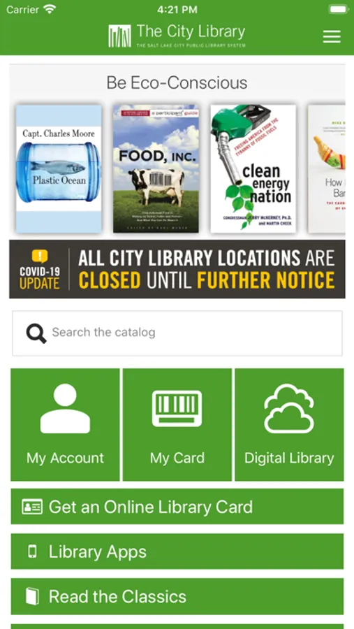 The City Library's app helps you browse the catalog, access items in the Digital Library, discover great new books, connect with The City Library's social media accounts, and have a digital version of your Library Card always available when it's time to check out.