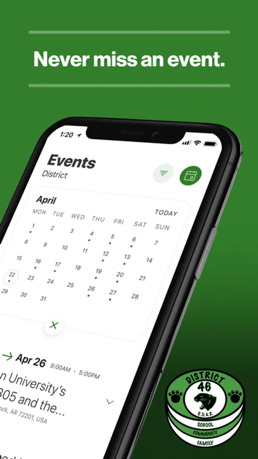 The event section shows a list of events throughout the district. Users can add an event to your calendar to share the event with friends and family with one tap.