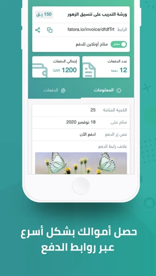 روابط الدفع: مع ميزة روابط الدفع بإمكانك إنشاء رابط دفع قابل للنقر ومشاركته عبر الواتساب، منصات التواصل الإجتماعي، SMS، البريد الإلكتروني وأي تطبيقات دردشة أخرى.