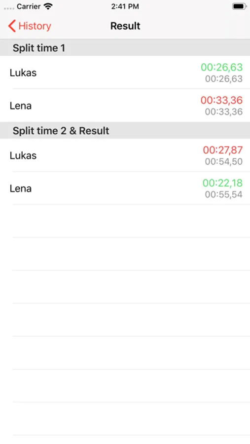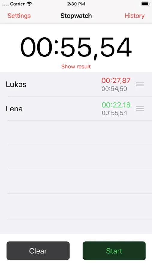 Stop several athletes at the same time with the sport stopwatch. Take split times from every athlete and see at a glance which split times were fastest or slowest.