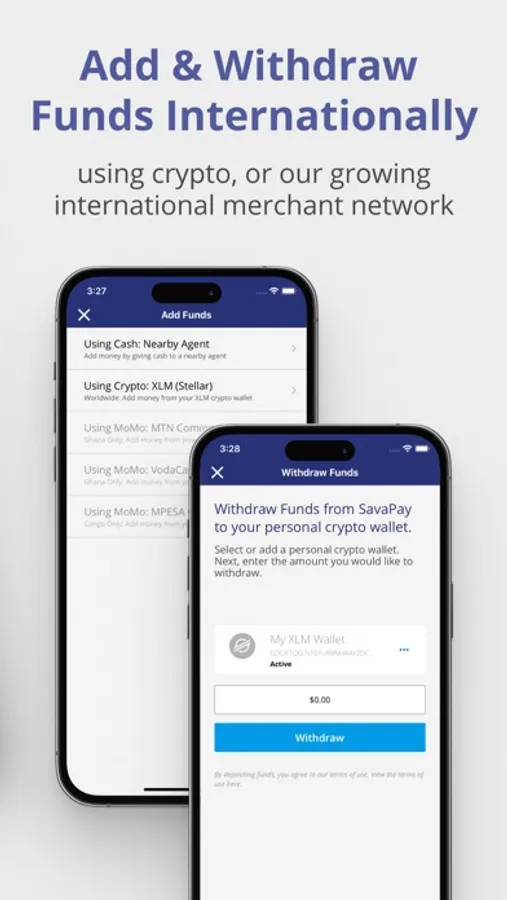 SavaPay users can add or withdraw funds using crypto, or cash with our growing international merchant network.