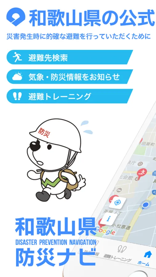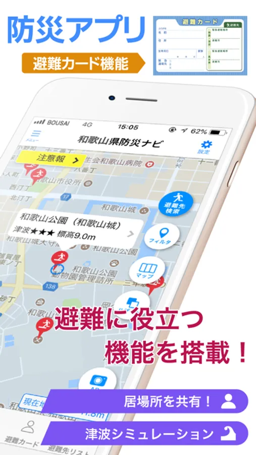 防災ナビには避難に役立つ様々な機能を搭載しています。避難先検索の他、家族の居場所確認や避難トレーニングなどもできますので、ぜひご活用ください。