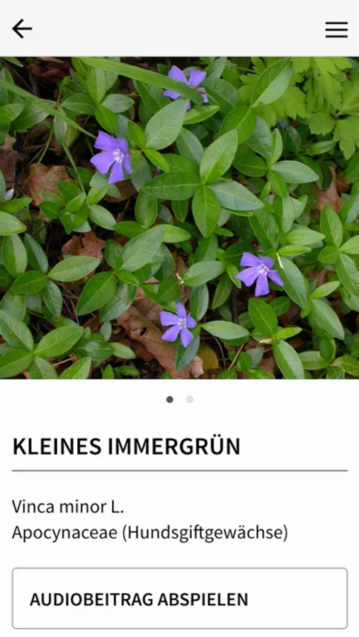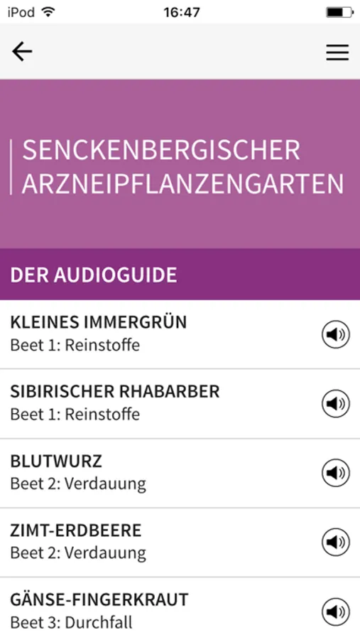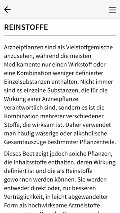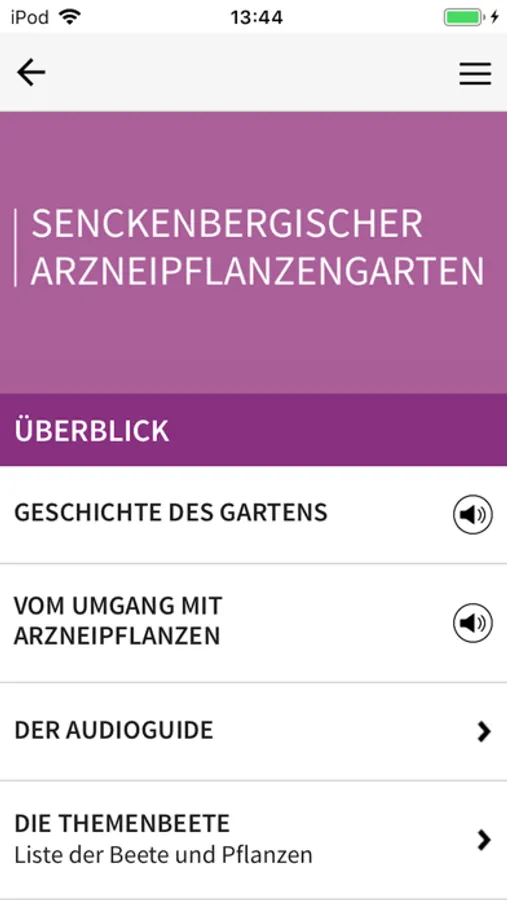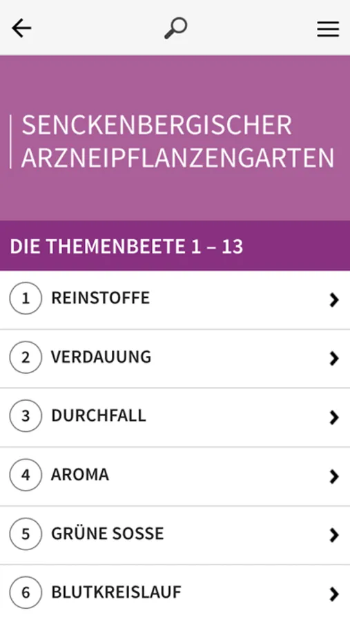 Die offizielle App des Botanischen Gartens Frankfurt in der ersten Ausbaustufe mit 30 Audioguide Texten und 143 bebilderten Pflanzenporträts zum Senckenbergischen Arzneipflanzengarten. In diesem Bereich des Gartens werden die Pflanzen in 13 Hochbeeten präsentiert, die jeweils ein Verwendungsgebiet wie z. B. „Blutkreislauf“, „Atemwege“ oder „Grüne Soße“ beschreiben.