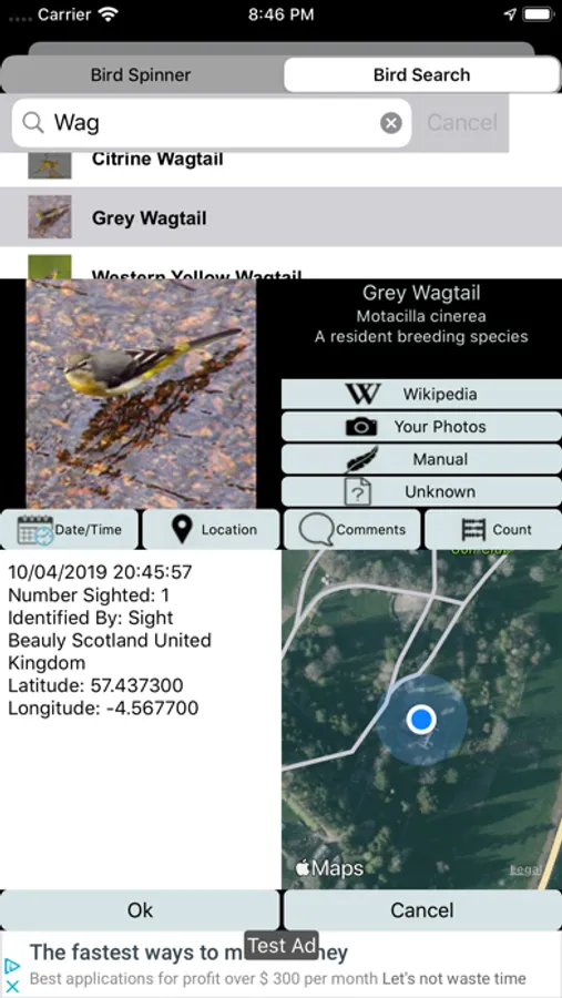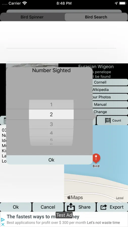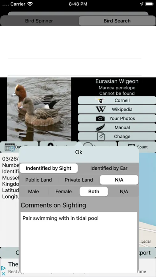 Identified the bird by ear? In the “comments” section, click on the “identified by ear” button and it will be noted. The same can be done with buttons for male, female, and to identify the setting as a public or private site. There is also plenty of space to enter your own comments. Tap the “count” button and scroll to quickly enter the number you have sighted.