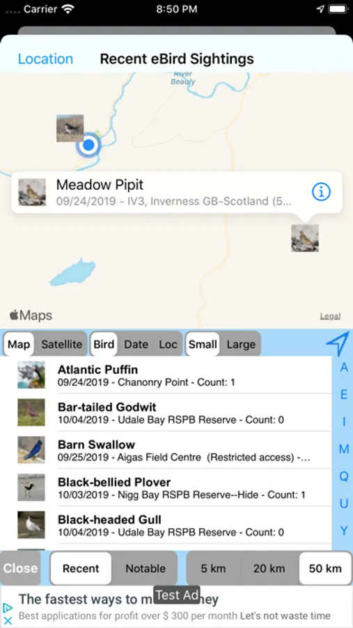 Out in the field or a vehicle? Tap the eBird Button and recent bird sightings in your vicinity. Another tap gives you directions to that recent sighting.