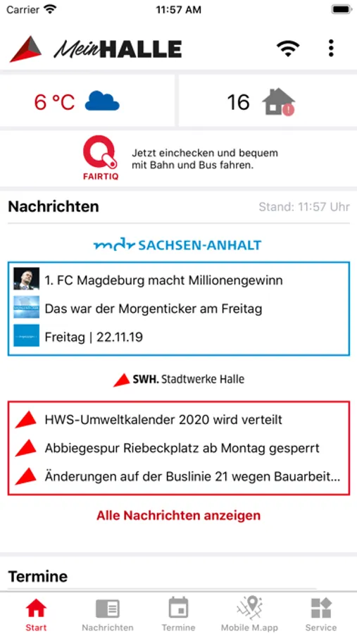 Mit nur einem Wisch immer mit der richtigen Fahrkarte unterwegs - zum besten und fairsten Preis. Die neue Ticketing-App für dein Smartphone ist da. Für alle Verkehrsmittel des Mitteldeutschen Verkehrsverbundes (MDV) in unserer Stadt (Tarifzone 210). In „Mein HALLE“ haben wir den Direktlink zu „FAIRTIQ“ auf die Startseite gesetzt.