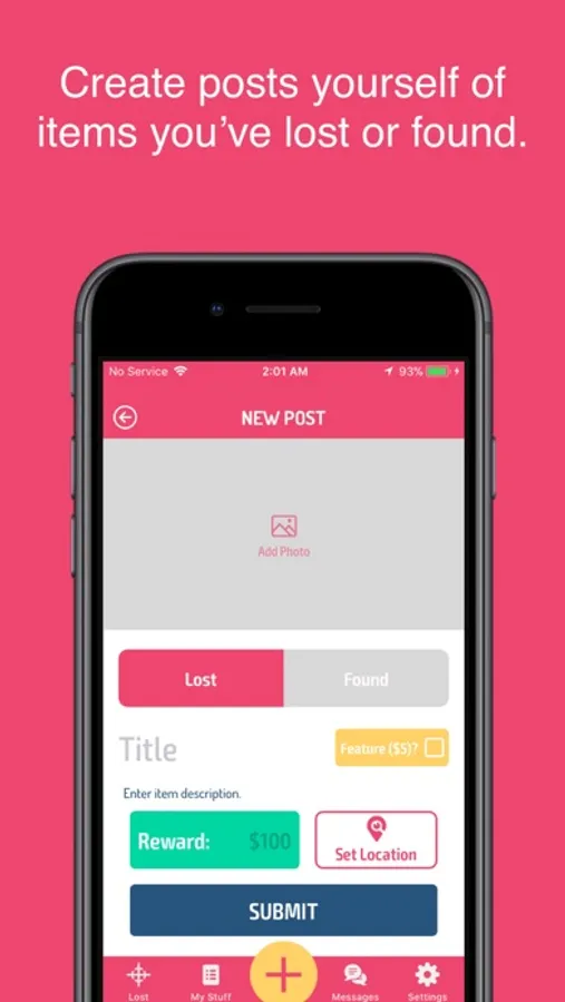 Ever lose something so valuable (i.e. cat, dog, laptop, etc.) that you're willing to shell out a reward for its safe return? This app does just that; quickly and easily create a new post adding item info, picture, presumed lost location, and attach a monetary reward amount to be sent out to our growing community!
