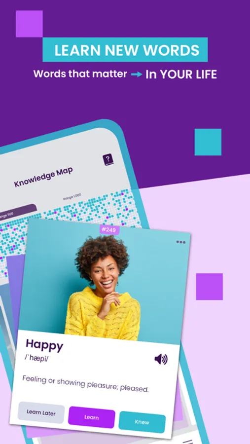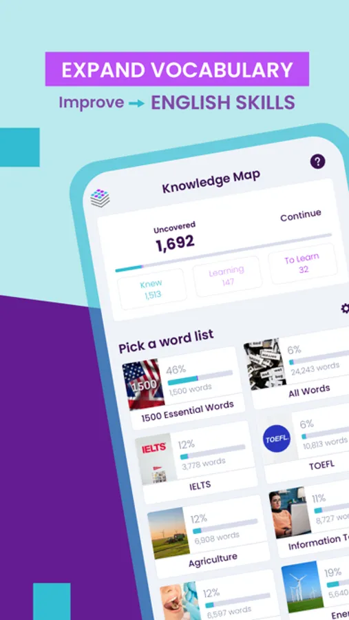 WordUp helps you build a map of your knowledge by identifying the words you know and the words you don't know. It helps you learn new words by identifying the gaps in your vocabulary and suggesting the most important and useful English words to focus on. By incorporating daily vocabulary and tracking your progress, the Knowledge Map enables you to steadily increase your vocabulary and enhance your understanding of English words.