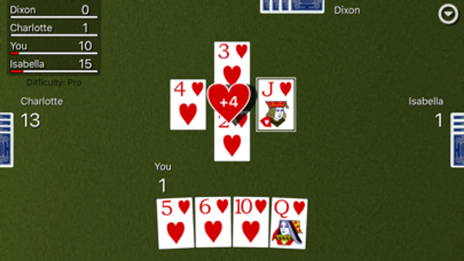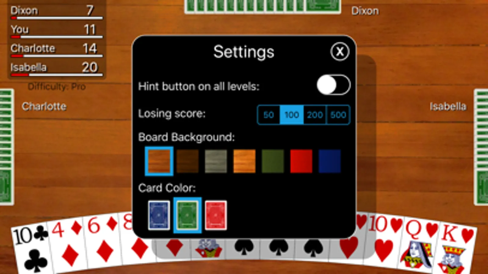 Improve your skills and become a Hearts pro! Hearts Card Classic has three different difficulty settings so you can work your way up to playing like a pro. Statistics are kept for wins and losses and moon shots so you can see yourself improving over time. All cards are dealt randomly to all players, so the difference between the Easy, Standard, and Pro computer players is in how they choose to play the cards they are dealt. A hint button can be turned on to help you see how the computer Pro player would handle your current situation.