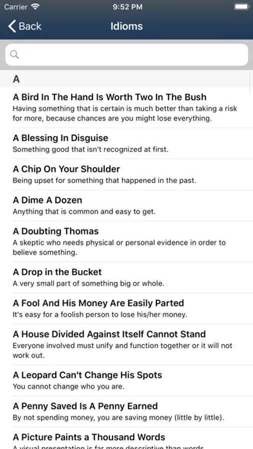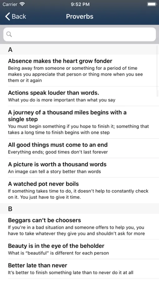 With this application you can list, learn their meanings and search proverbs and idioms. Also application provides information about other language proverbs and idioms.