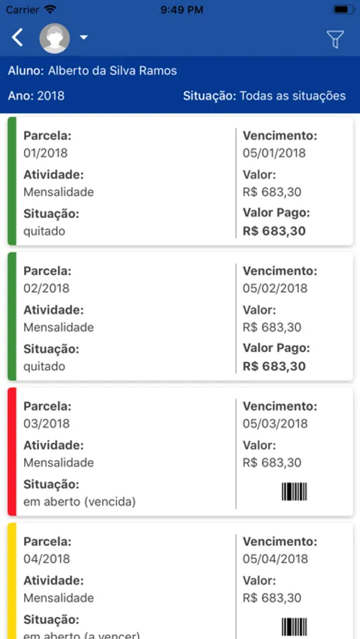- Consulta ao extrato financeiro e emissão de boleto (apenas para os responsáveis financeiros).