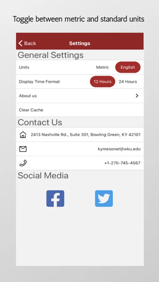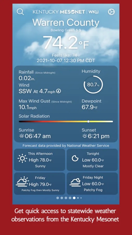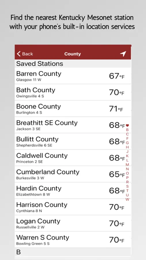 • Use your phone’s built-in location services to determine the closest Kentucky Mesonet station or select a default station.