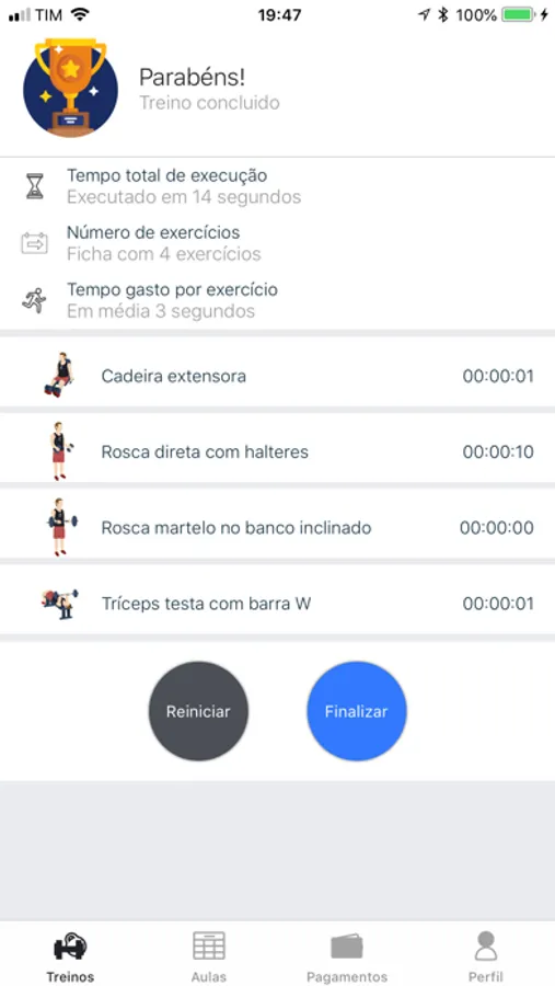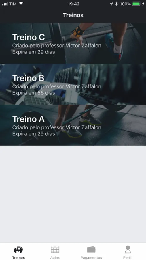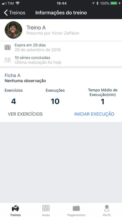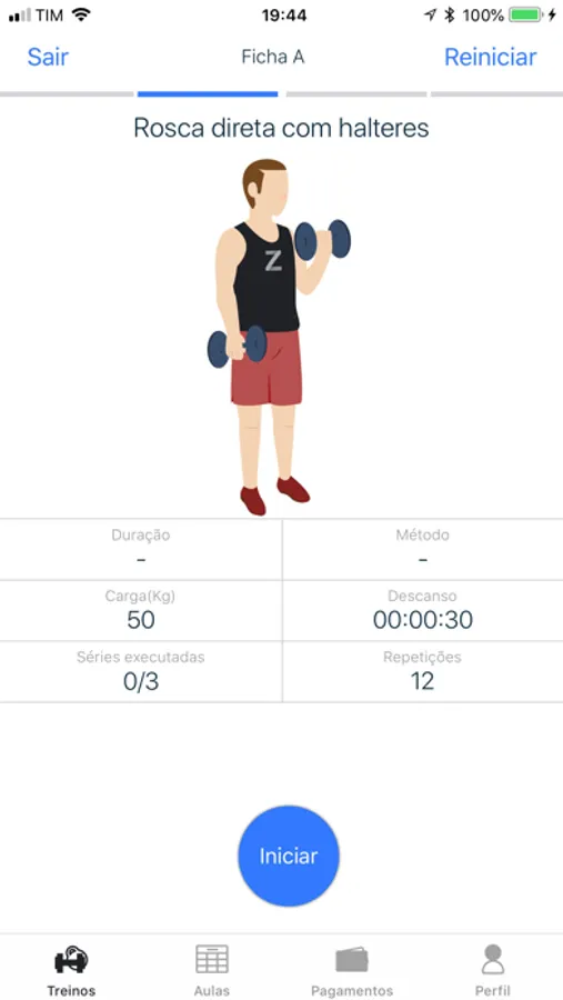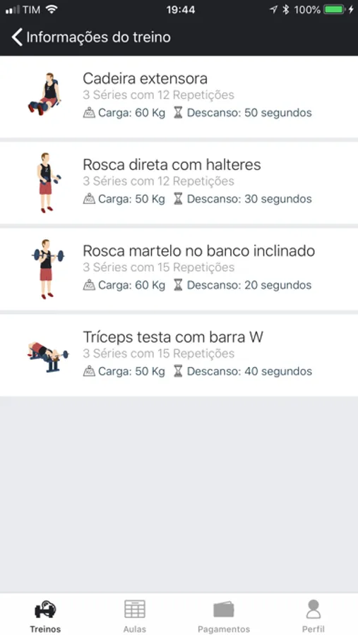 - Cada exercício contém informações como carga, repetições, descanso etc.