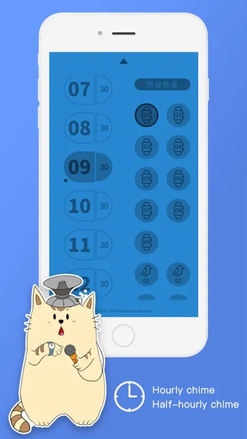 • Customize the ringtone of each hour or half-hour with a closable notification.