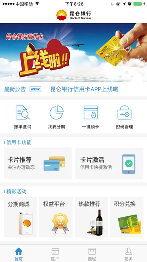 昆仑信用卡是昆仑银行信用卡官方客户端,设计简洁流畅,持卡人可享受7*24小时贴身的信用卡服务。功能包括卡片激活、账单查询、分期付款、密码管理、积分商城、精彩活动、权益服务等。