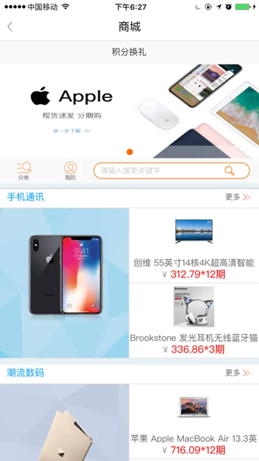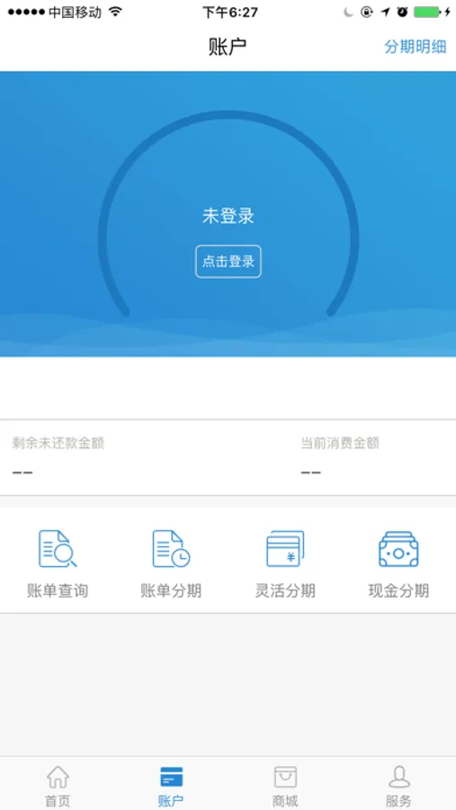 2、“账户”提供账单查询、分期付款业务、分期明细查询等功能。