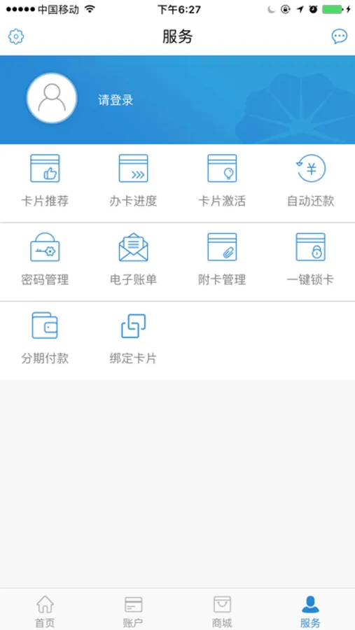 4、“服务”提供卡片推荐、办卡进度查询、卡片激活、自动还款设置、密码管理、电子账单、附卡管理、一键锁卡等功能。