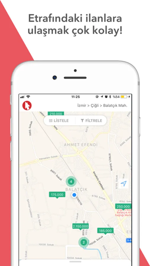 Harita ekranında, bölgenizdeki tüm emlak ilanlarını fiyatlarıyla birlikte görebilirsiniz.