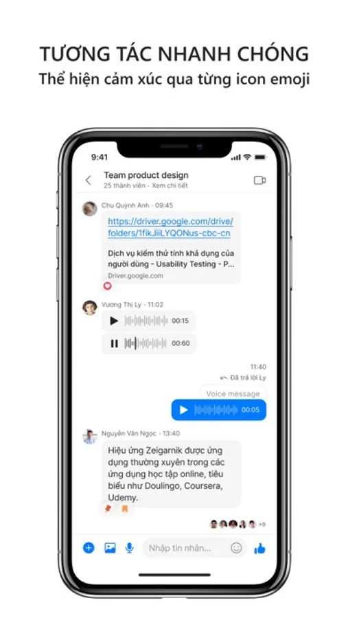 - Tạo nhóm chat và thảo luận theo phòng ban, dự án.
