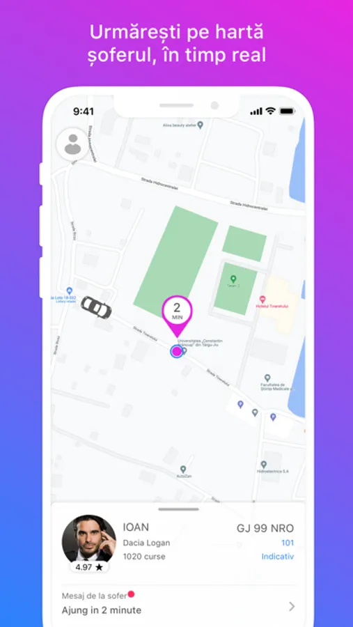 * Ajustezi punctul de ridicare pe harta live, astfel șoferul va sosi exact unde iți este ție mai confortabil.