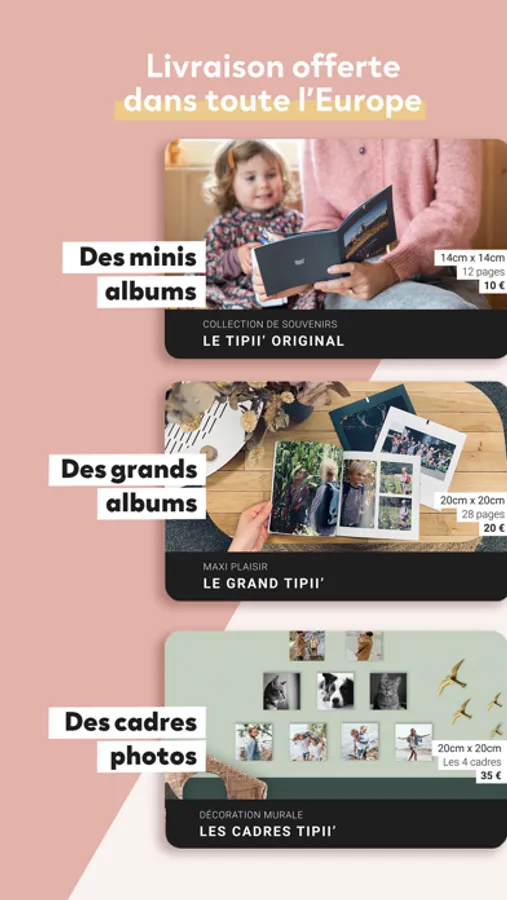 At Tipii', we provide free delivery throughout Europe, so you can enjoy your products without any additional costs. We use high-quality paper to ensure sharp and long-lasting prints, while our photo albums feature soft covers for easy handling and an elegant look. Preserve your memories uniquely with Tipii' products.