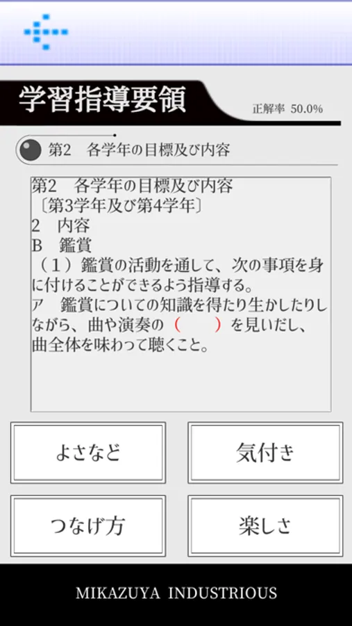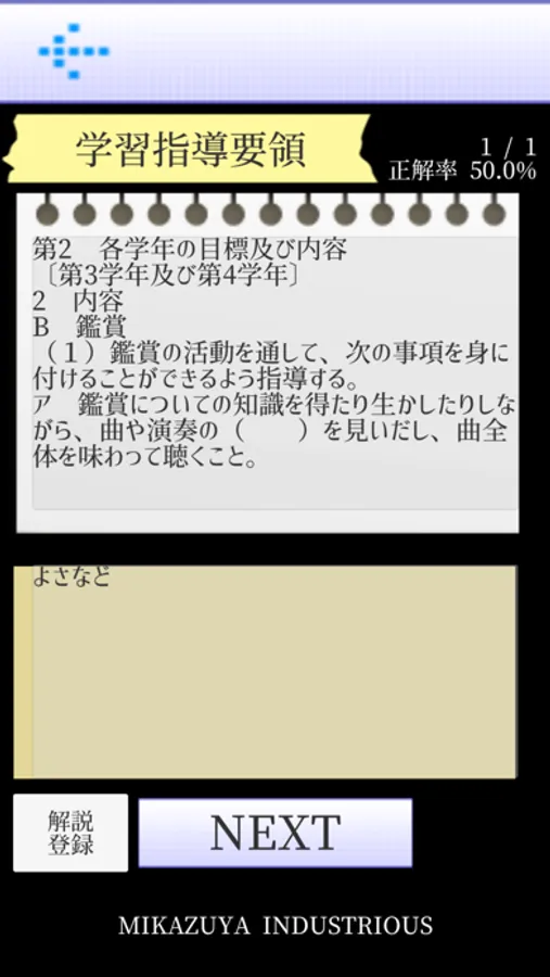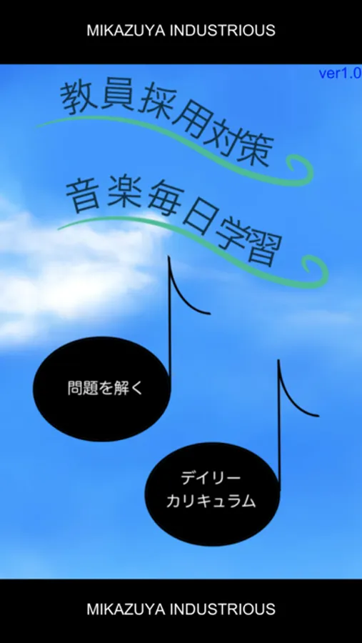 小学校教員を目指す全ての人に向けた、音楽の学習アプリです。『学習指導要領問題』『調・音階』『曲名と作曲者』『和音とコードネーム』の4ジャンルを本アプリで学習することができます。また、カレンダーによって日々の学習日が自動で作成されます(午前・午後別)。さらに、設定によるリマインドが可能で、1日最大2回の通知を端末に送ることができます。
