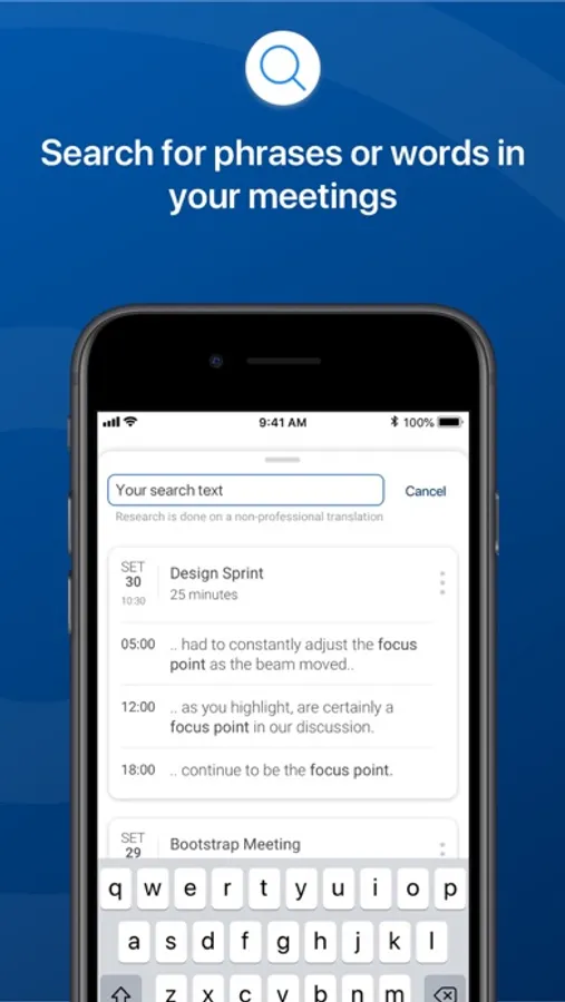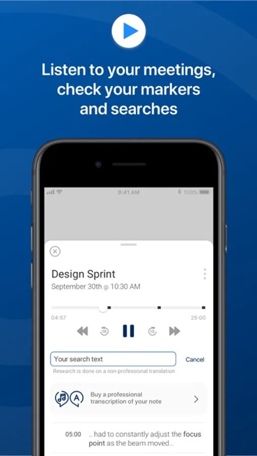 Meeting Recorder is your personal assistant for meetings. It listens and transcribes meetings and conferences for you, allowing you to search for words and phrases within your recording. You can record your most important conversations and save time, helping you work more efficiently, accurately and professionally.