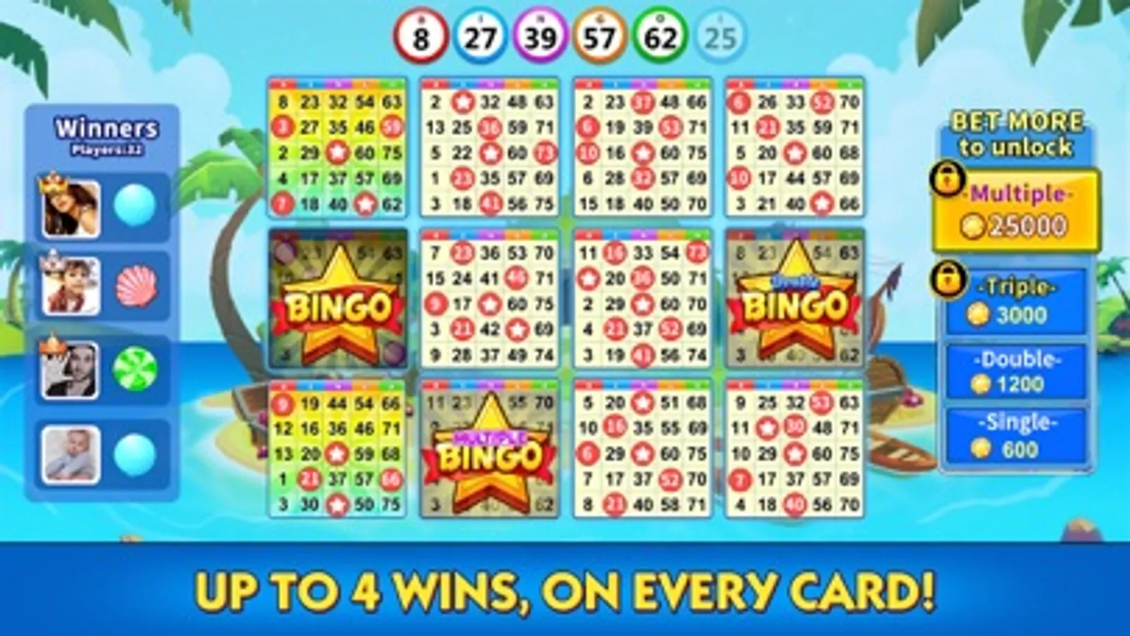 - Play up to 8 cards with 9 crazy power-ups, dive yourself into a lottery party! It's like a slingo adventure!
