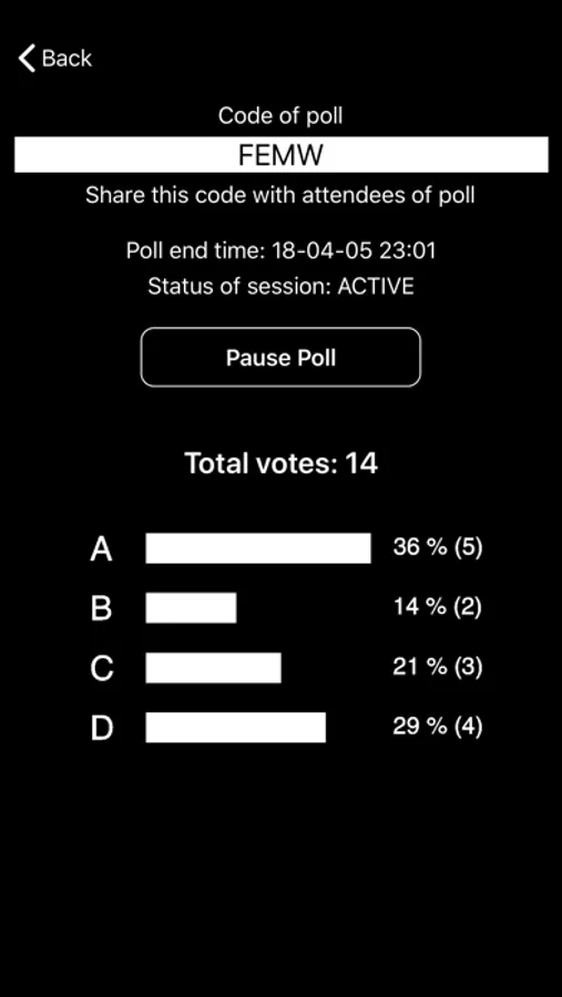 Just initiate a poll and share a code with the attendees who also need the app. There's no registration or login necessary. Voting is completely anonymous and people can just answer A, B, C or D. You see the results in realtime on your phone.