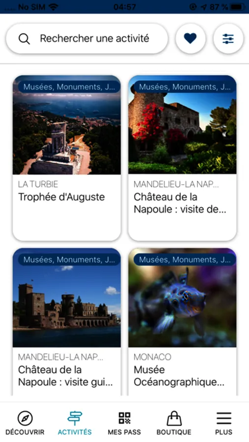 Il a alors accès aux informations relatives à sa Côte D'Azur Card : date de validité, lieu d'achat, QRcode, liste des prestations disponibles et état de consommation (sous réserve d'une synchronisation avec le serveur).