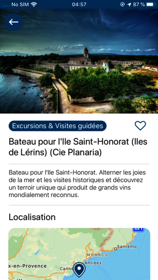 L'application Côte D'Azur Card permet à son utilisateur de consulter la liste des sites partenaires de la Côte D'Azur Card même sans connexion internet, et pour chacun d'eux d'obtenir des informations détaillées : Nom, Photo(s), description, adresse postale, localisation sur la carte google Maps. Ainsi il dispose d'un guide touristique numérique interactif pour l'accompagner pendant son séjour en Côte D'Azur.