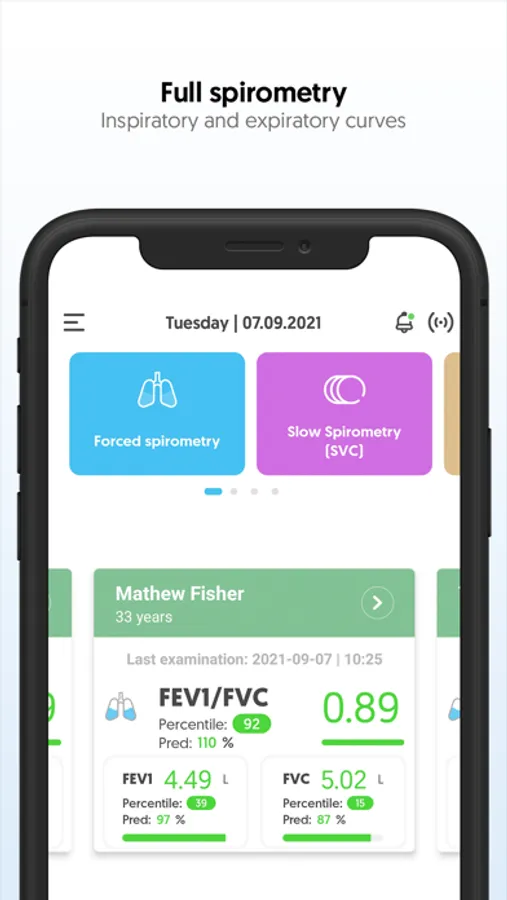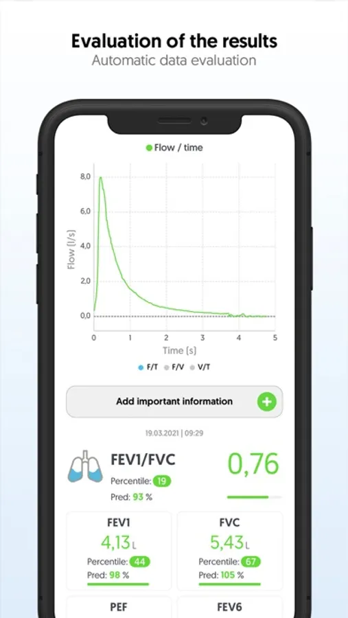 We made spirometry easy and accessible to any healthcare professional, regardless if the examination is performed in the office, hospital (bedside testing) or at home. Advanced AI based algorithms assist during the inhale/exhale maneuvers to assure high quality examination and to prevent typical errors during spirometry performed by less experienced patients and operators or without supervision.