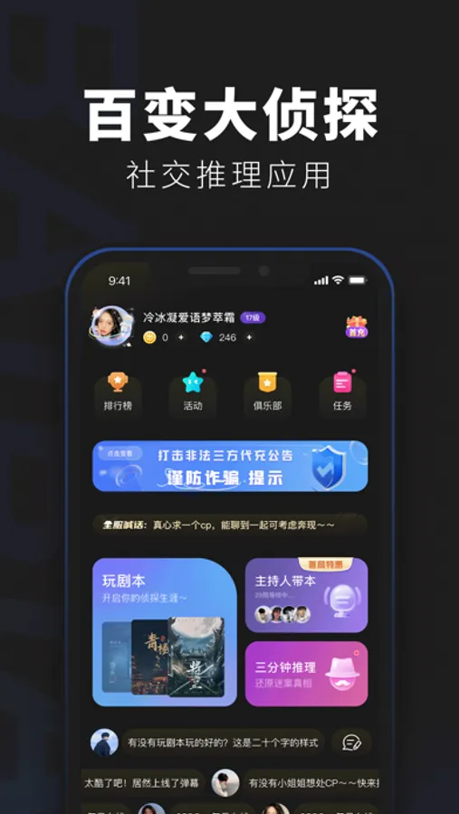 与其他的剧本杀App相比,百变大侦探是很特别的一个,拥有精美场景搜证,丰富的玩法,也拥有众多精品的剧本,还有线上密室跑团剧本等等你来发现。