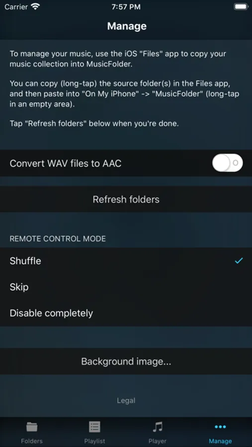 IMPORTANT: You cannot use MusicFolder to play music from the regular "Music" app. Instead, you use the iPhone's "Files" app to copy your folder-based music library from your computer (or anywhere else) into MusicFolder.