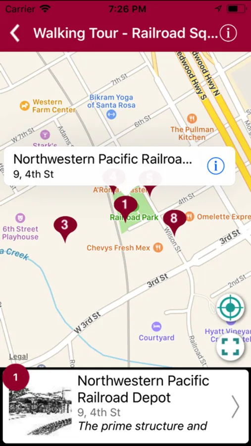 We've included five GPS-enabled walking tours in the downtown area: Railroad Square, Cherry Street, Civic Art Walk, Rose Street and West End.