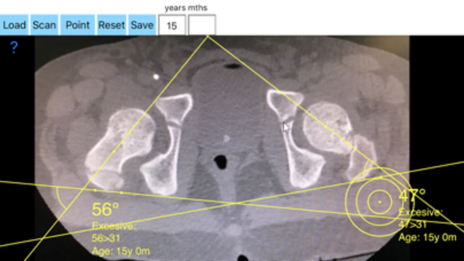In a busy everyday practice, the examiner have to draw lines in X-rays or in clinical settings, this it is time consuming and cumbersome. Accessory instruments like protractors, hinged goniometers, well sharped pencils, rulers or even transparent papers must be available. The app offers a very convenient and accurate way to perform most common radiographic measurements in a blink of an eye in front of your screen. The build in feature of the app, allows results to be categorized ( increased anterversion, excessive anteversion, decreased anteversion, or retroversion) according patient’s age by comparing the data with normal reference database, this feature may help decide what could be considered normal or pathologic.